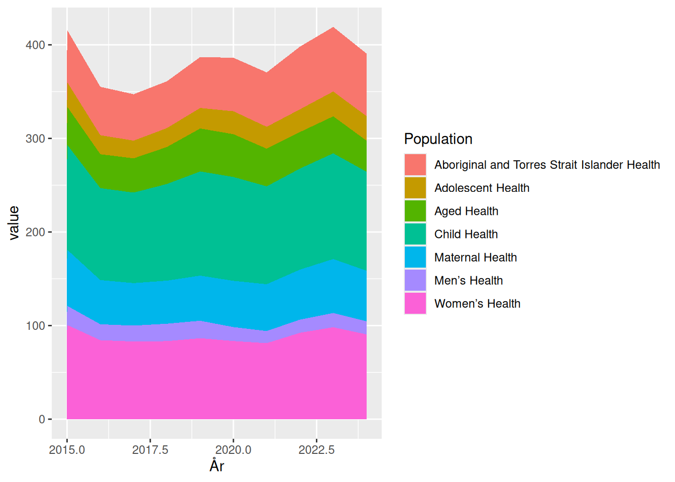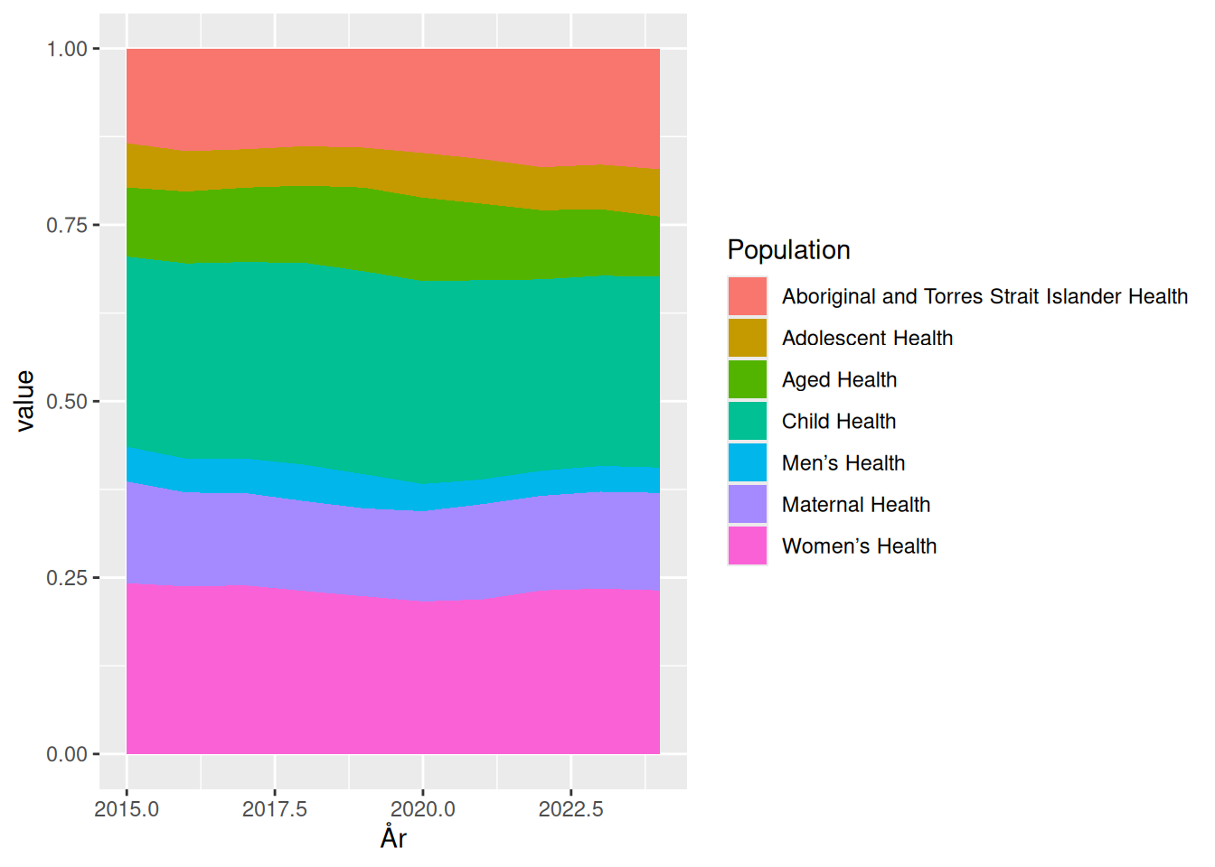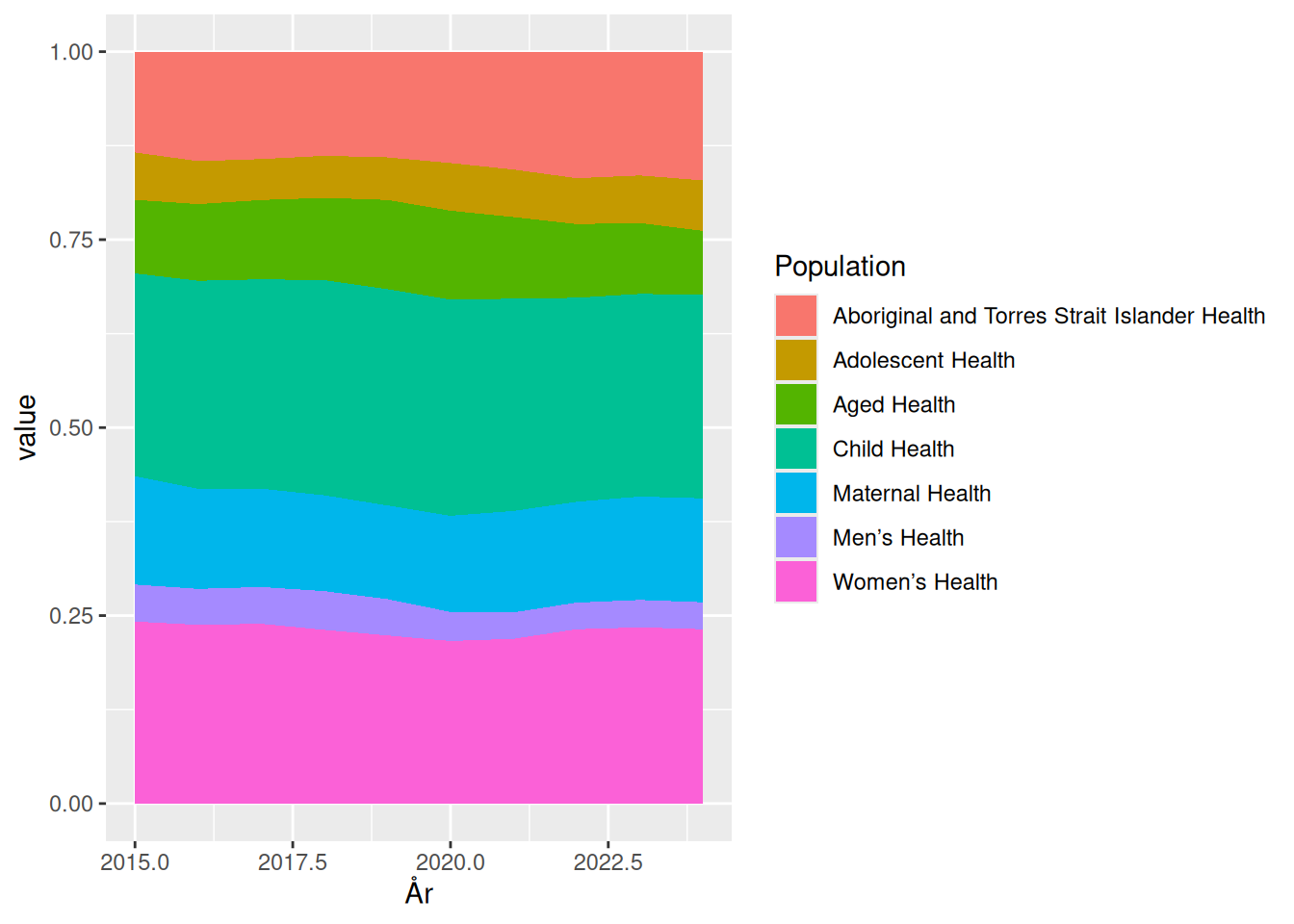 Det ændrer ikke på at det er vanskeligt at aflæse på grafen hvor stor en andel der bruges på “Aged Health”, og en tabel vil ofte være at foretrække hvis man faktisk er interesseret i udviklingen. Det er næppe et tilfælde at de oprindelige data netop præsenteres som en tabel.